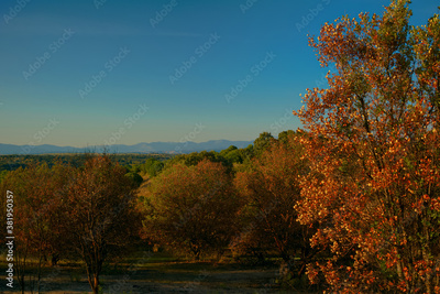 krajobraz jesienią las drzewa liście natura zieleń przyroda kolory pomarańczowy błękit niebo