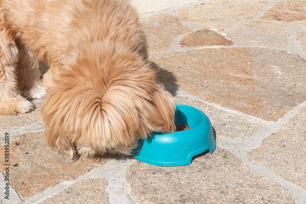 Dog eating near its blue plastic dog bowl