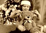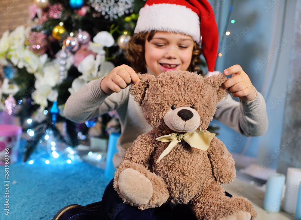 a little baby boy with curly hair in a red Santa hat holding a Teddy bear on the background of a Christmas tree and decor.