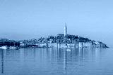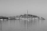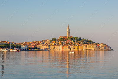 Silhouette of the historic city Rovinj at morning time with light reflections in the water