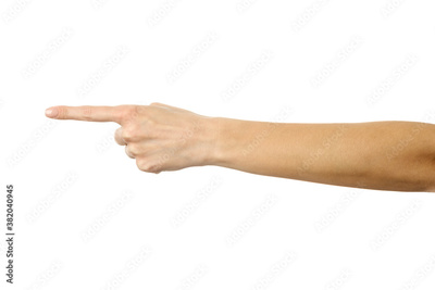 Pointing left. Woman hand gesturing isolated on white