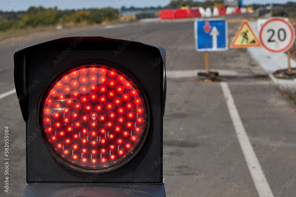 The traffic light is red, repairs on the asphalt road, road signs.