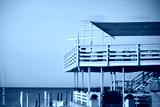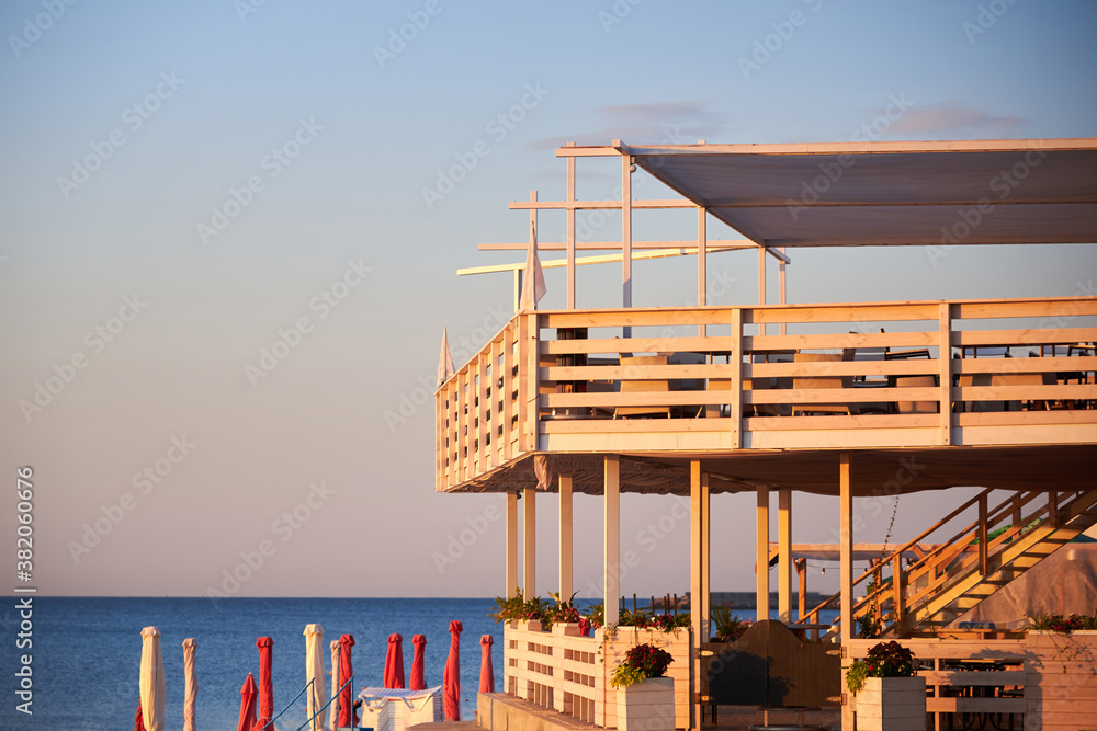 Beach before the opening, folded sun loungers and umbrellas, empty tables in a cafe.