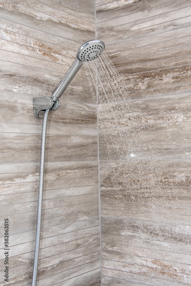 From the shower mounted on the wall, water flows into the bathroom. Modern interior and interior decoration.