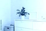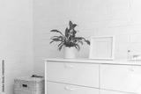 Angled close up of white dresser against painted brick wall with pot plant and square picture frame (selective focus)