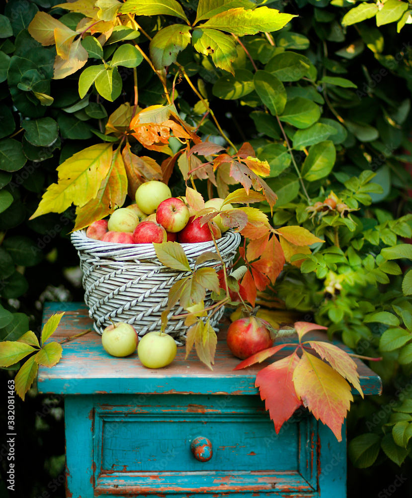 autumn harvest, apples, in the garden, bright, juicy, autumn, Apple, leaves, autumn background, background, green, yellow, red, orange, color, mood, warmth, rural life, country pictures, vintage, coun