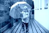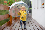 Cute blond toddler child, boy, playing in the rain with umbrella on a foggy autumn day