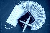 a toy plane on a gray concrete background, dollar bills, and a face mask, the concept of closing borders around the world due to coronavirus, financial losses of airlines and tour operators.