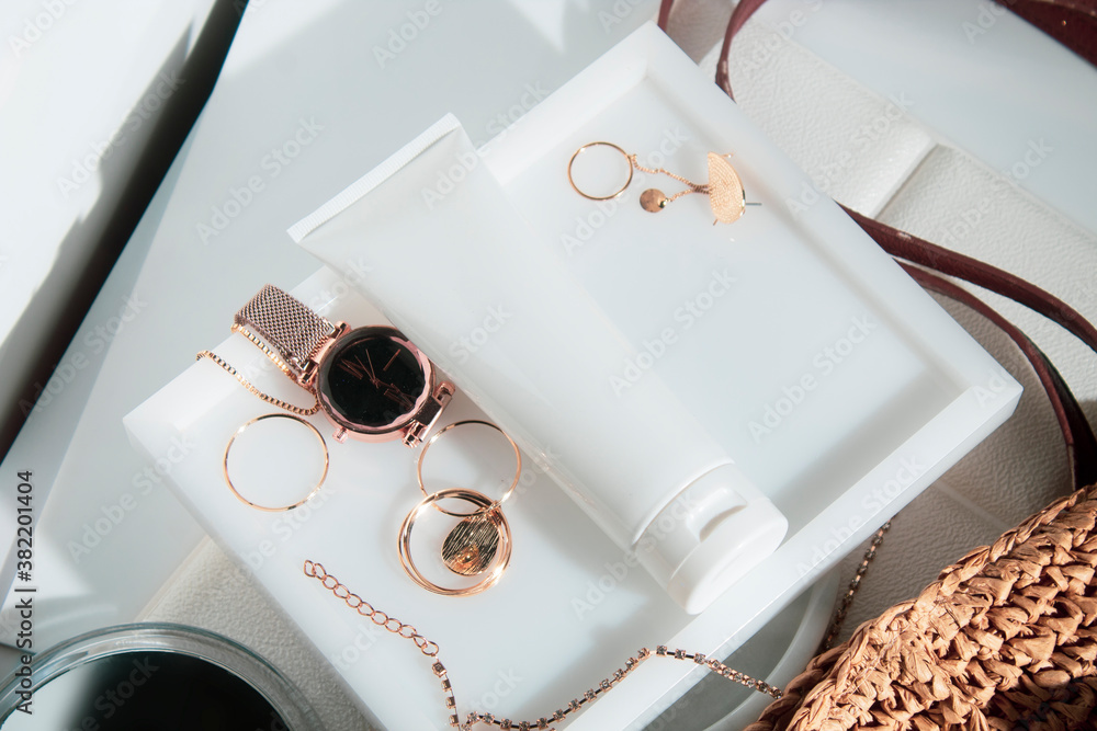 beauty treatment medical skincare cosmetic lotion cream serum mockup bottle packaging product on white decor background in healthcare pharmaceutical medicine