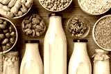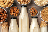 Concept of organic vegan non dairy milk with glass milk bottle and bulk products