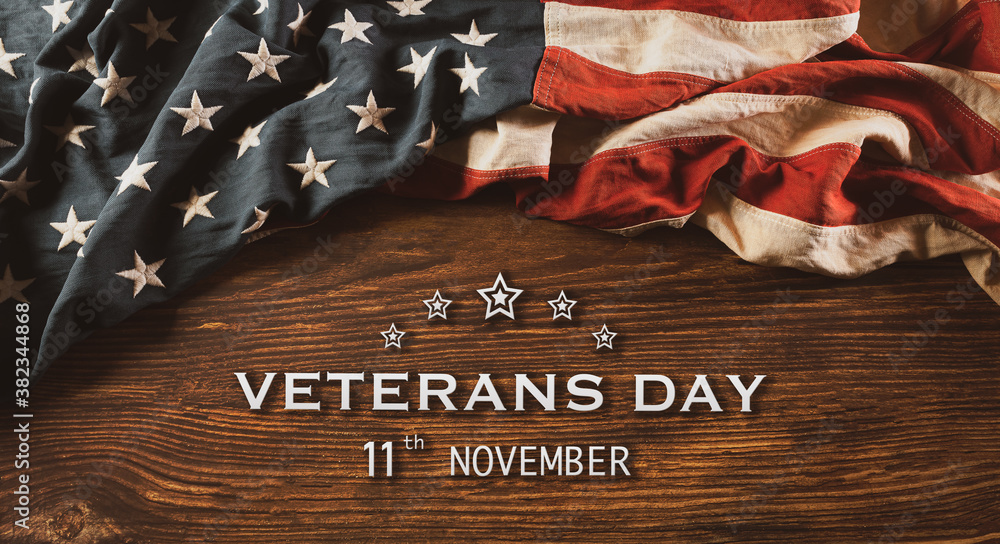 Happy Veterans Day concept. Vintage American flags against old wooden background. November 11.