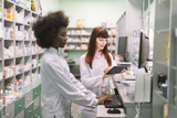 Portrait of two smiling friendly multiethnical women pharmacists working on computer and tablet in modern pharmacy and making order for medicines in distribution company