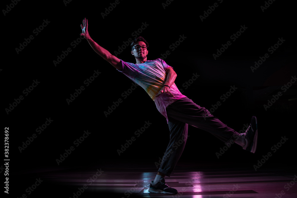 Professional break dancer jumping, practicing modern hip-hop dance in pink neon light