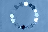 Amazing round festive frame made with set of different colorful shining shapes on bright pink background flat layer composition with space for text