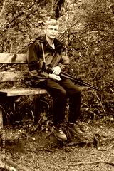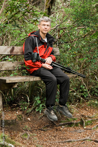 Mature man with camera and tripod sitting on wooden bench