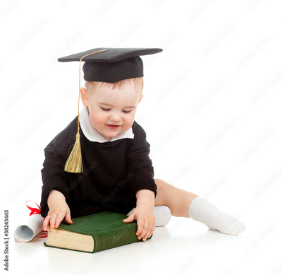 Baby in academician clothes with roll and book