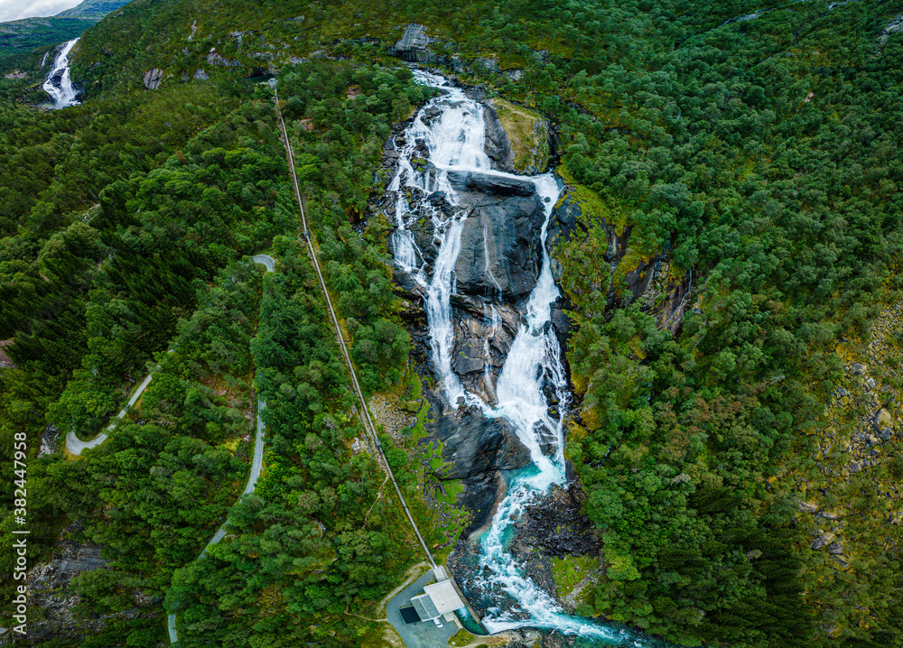 Nyastolfossen falls, second in cascade of four waterfalls in Husedalen valley, Kinsarvik, Norway