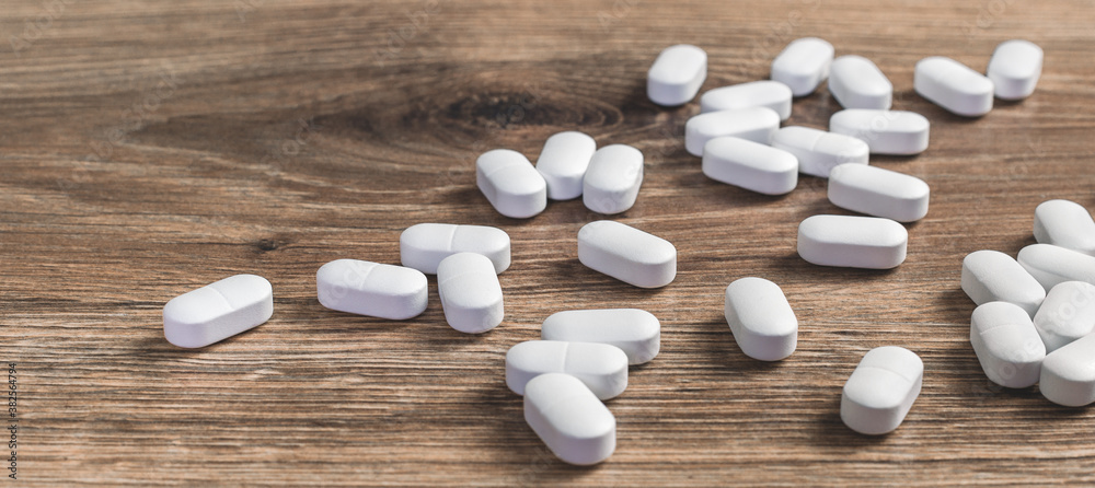Medical background. Several white capsule tablets or pills scattered on wooden table. Healthcare pharmacy and medicine concept. Painkillers or prescription drugs consumption. Copy space