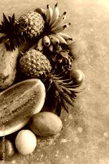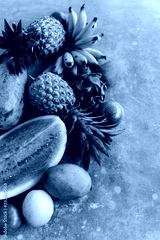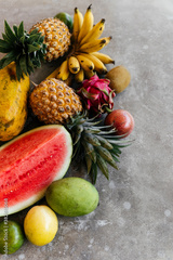 Fresh healthy tropical fruits, melon, pineapple, mango, bananas, dragon fruit Summer food vitamins concept