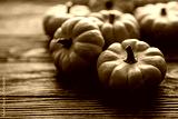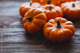 Diverse assortment of pumpkins on a wooden background. Autumn harvest.