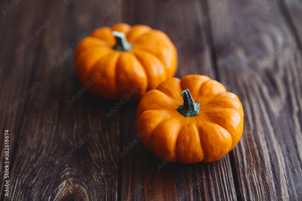 A group of miniature pumpkin on a wooden slat background