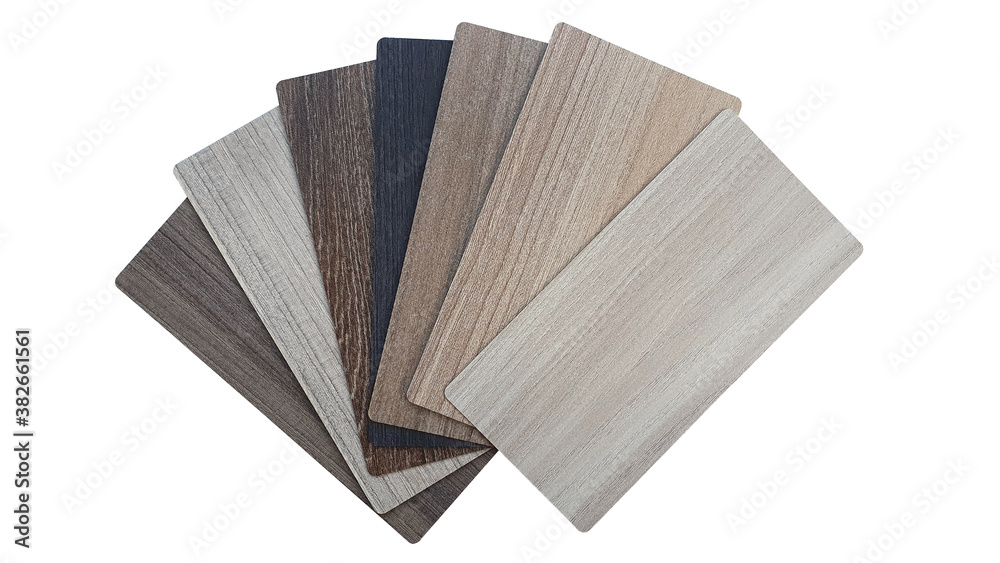 wooden texture laminated samples chart for interior design isolated on white background with clipping path.