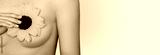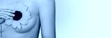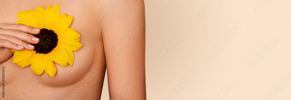 Unrecognizable woman holding flower near breast. Concept of medical care and prevention breast cancer and disease.