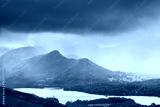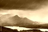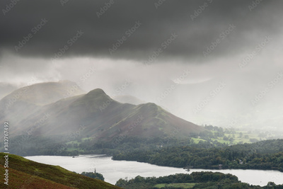 Stunning epic landscape image across Derwentwater valley with falling rain drifting across the mountains causing pokcets of light and dark across the countryside