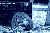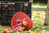 Autumn harvest in garden. Harvesting apple fruit. Plastic crate and basket, wooden ladder in orchard
