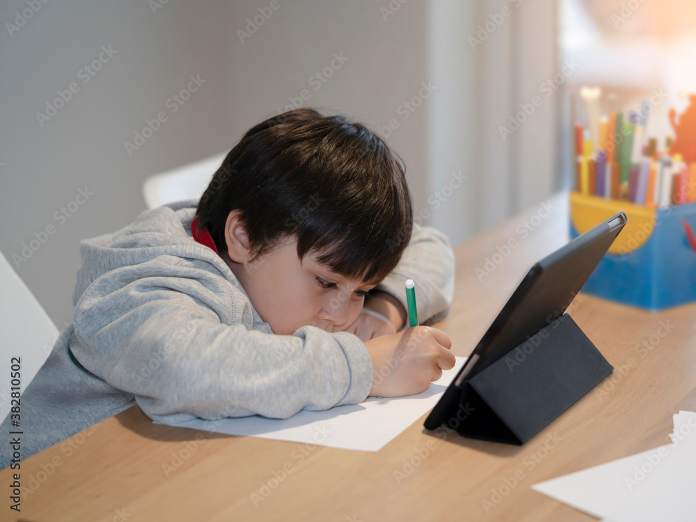 New normal life style, Portrait of school kid sitting alone doing homework, Child boy holding black pen drawing and writing on white paper on table, Elementary school and homeschooling concept