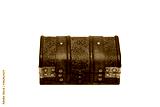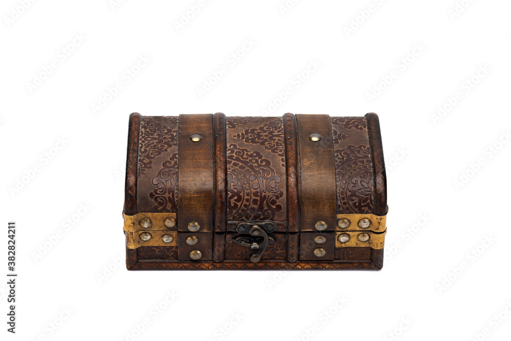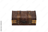 Old wooden ancient closed chest isolated on white background. Money, financial, growth concept.