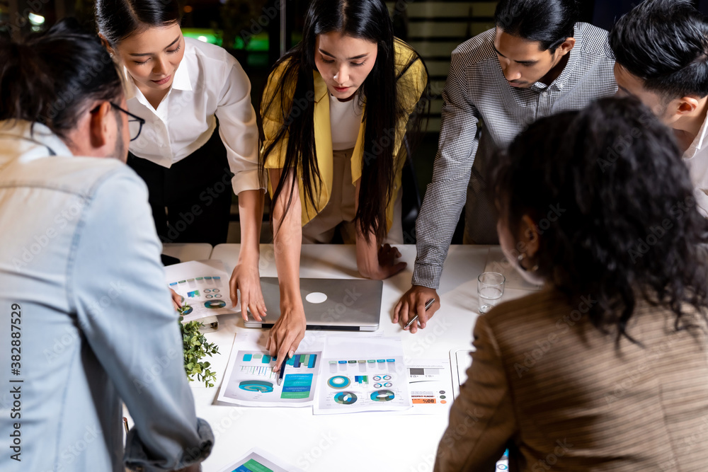 Working late, interracial asian business team brainstorm idea meeting.