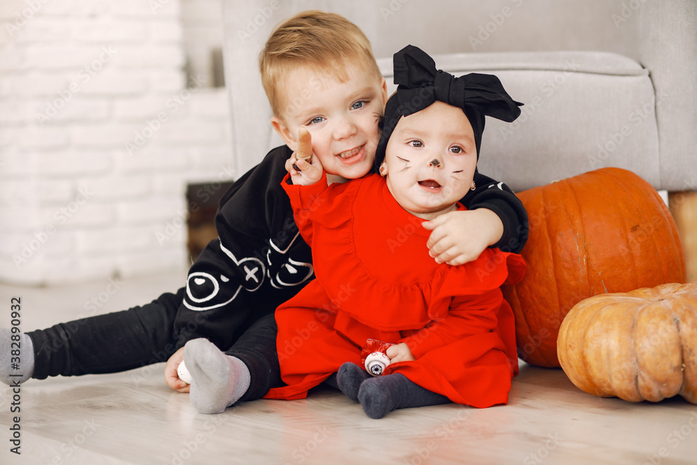 Happy kid on Halloween party. Childhaving fun indoor. Bby wearing costume. Concept of children ready for a party.