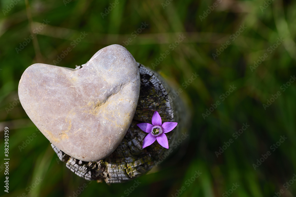 A pebble in the shape of a heart lies, photographed from above, on a wooden pole, against a green background in nature