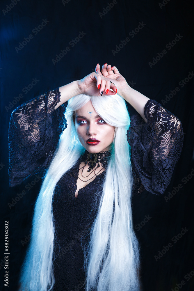 Sexy witch with hallowen makeup and long white hair on black background