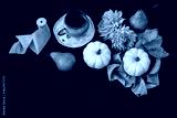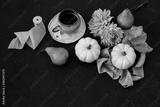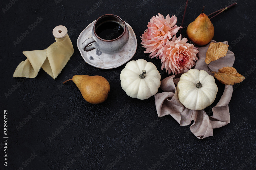 Autumn still life composition. Cup of coffee, pear fruit and white pumpkins with pink dahlia flowers on black table background. Moody fall, Thanksgiving design. Flat lay, top view.