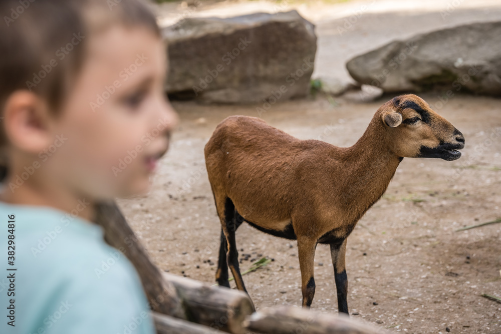 Shallow focus of a kid watching animals at a zoo under the sunlight