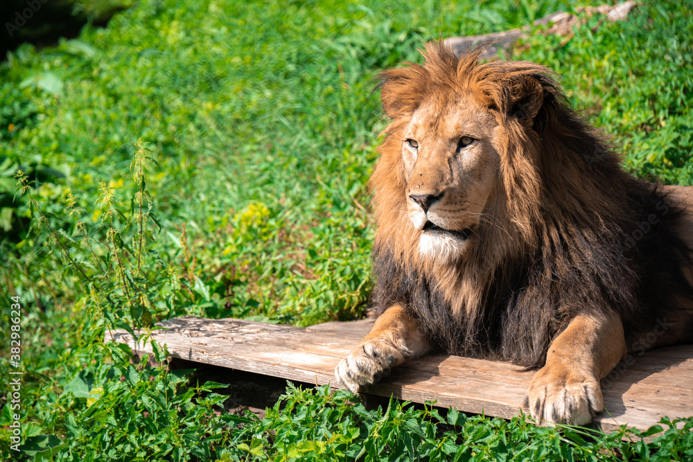 A lion lying on the wooden log among grass with a calm face expression