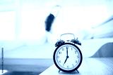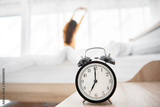 Closeup alarm clock having a good day with background happy woman stretching in bed after waking up, sunlight in morning.