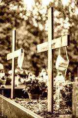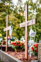 Protective mask on the cross of grave in cemetery