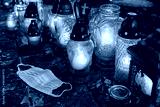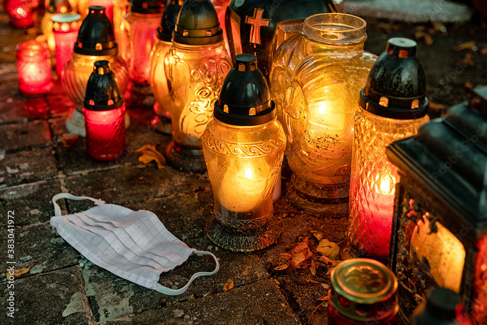 Flame from candles in tanterns and protective mask on ground. All Souls day