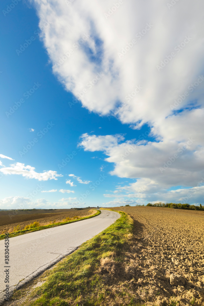 Rural landscape at sunset, empty road of countryside, blue sky with clouds