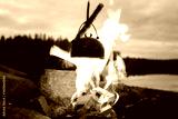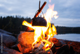 Steaming pot on bonfire. Cozy camping place in wild near the lake. Wonderful evening atmospheric background of campfire. Beautiful flame of small magic bonfire.