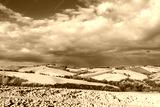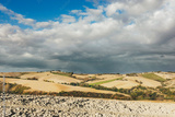 Countryside landscape, plowed fields on october, blue sky and clouds