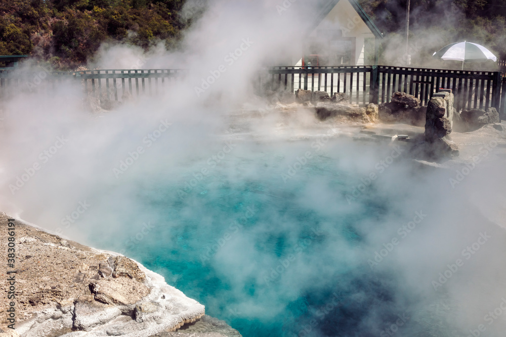 Steam rising from geothermal pool in Maori village