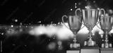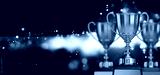 close up golden trophy award with falling confetti. copy space for text. 3d rendering.