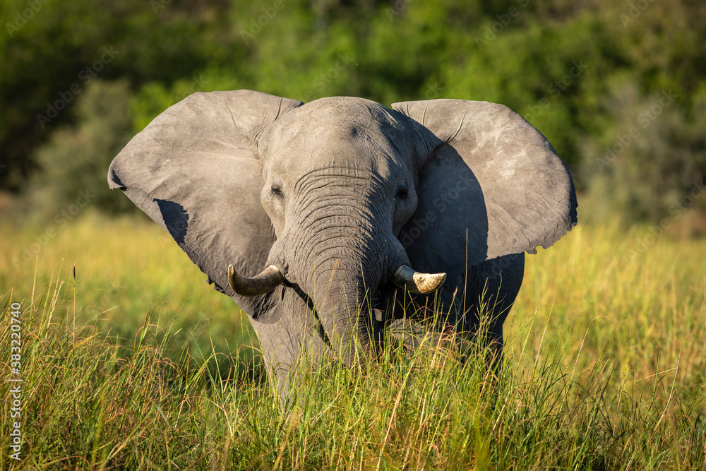 Elephant walking towards camera in afternoon sunlight in Khwai River in Okavango Delta in Botswana