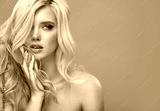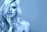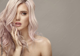 Much attractive woman with long healthy curly hair of pink color on beige isolated with free copy space