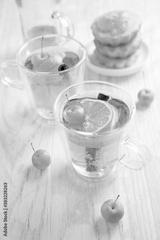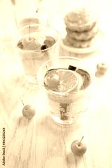 Apple cider cocktail with cinnamon and small lemon curd tarts