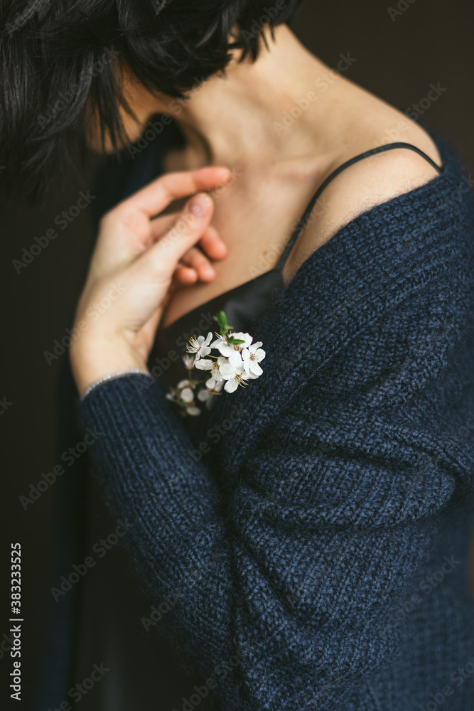 Woman in a hand knitted cardigan with a blossiming branch in her hand.